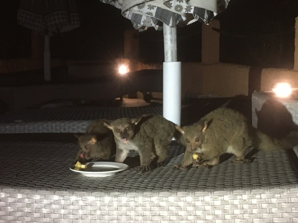 Also small eared greater galago (Otolemur garnettii) is common in Diani Beach and many hotels feed them in the evening with fruits. Bananas are favourite fruit of these cute primates